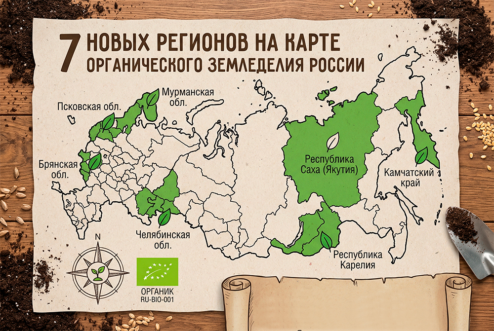 На начало 2026 года производители органической продукции работают в 58 субъектах Российской Федерации. Только за прошедший год география органического земледелия в России расширилась сразу на 7 регионов. Начало развитию производства сертифицированной продукции со знаком «органик» было положено в Челябинской, Псковской, Мурманской и Брянской областях, в Камчатском крае, а также в Республиках Саха (Якутия) и Карелия. Ряд производителей этих регионов присоединились к коллегам из других регионов и отказались от использования химических препаратов для борьбы с вредителями и заболеваниями растений, стимуляторов роста и всевозможных агрохимикатов (за исключением тех, что разрешены к применению).